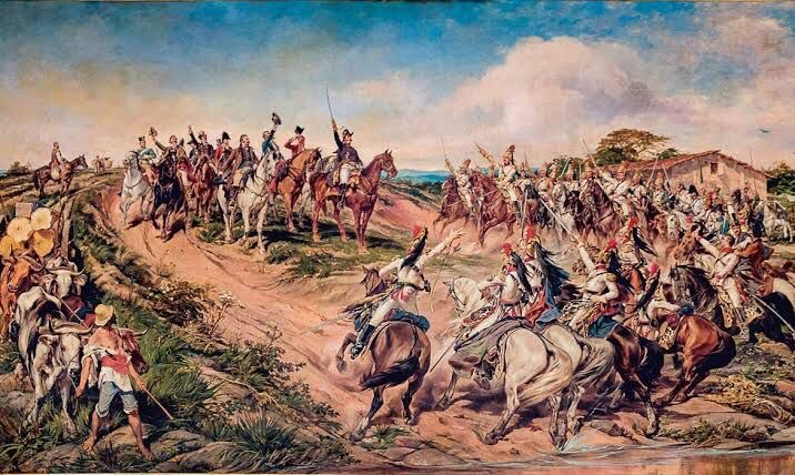 Às margens do Ipiranga, de espada em punho, Dom Pedro I proclama a Independência do Brasil, com a célebre frase: "Independência ou Morte?"