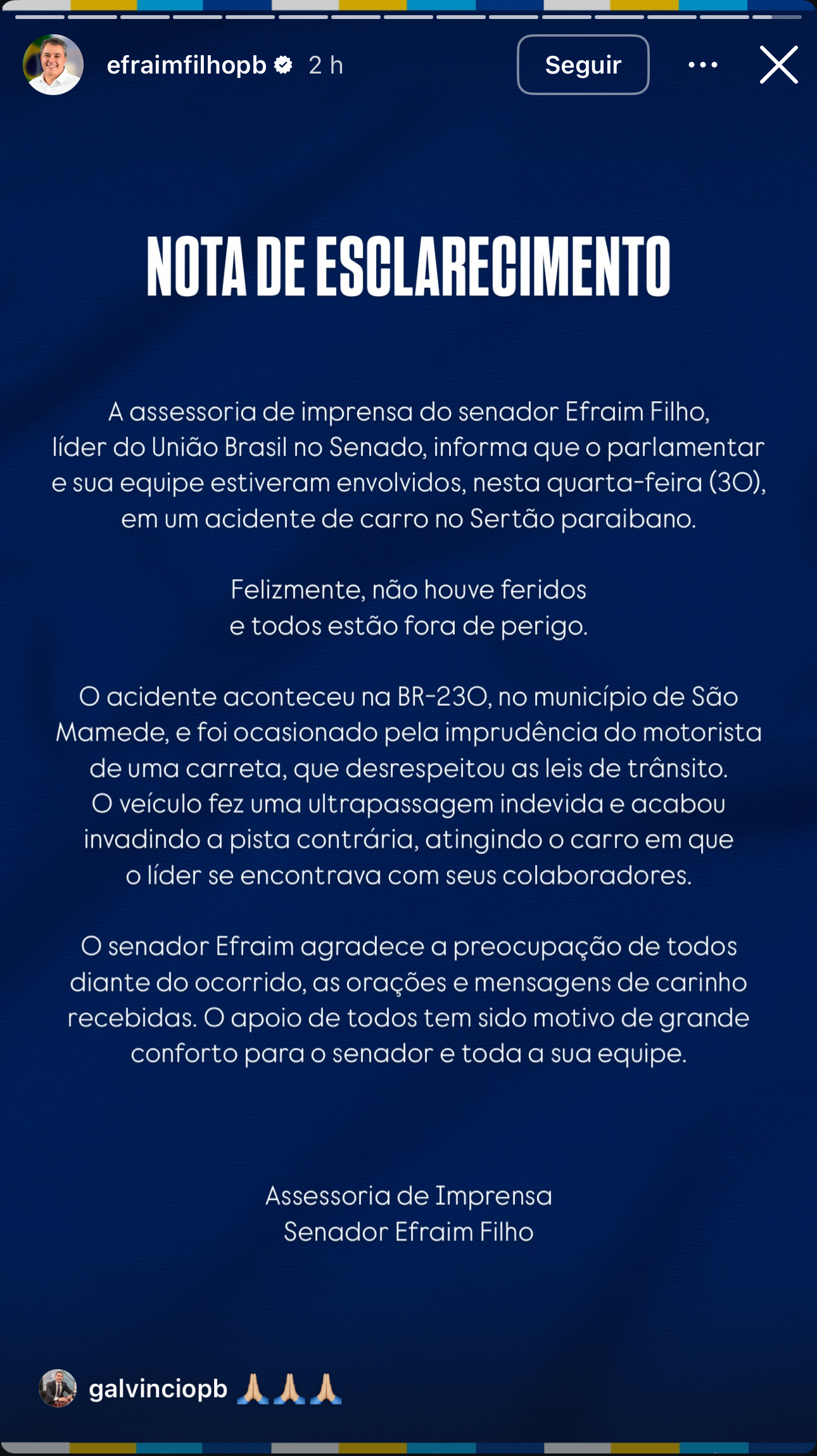 No retorno, após o evento, de acordo com informação da assessoria, Efraim foi vítima de imprudência de um motorista de uma carreta, que teria ultrapassado a faixa contrária indevidamente, vindo a colidir com o veículo do senador.