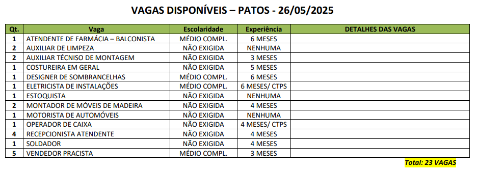 Em Patos, são oferecidas 23 vagas, com destaque para vendedor pracista (5), recepcionista atendente (4), auxiliar de limpeza (2) e montador de móveis de madeira (2). Também há uma vaga para os cargos de vendedor de farmácia, costureira em geral, designer de sobrancelhas, eletricista de instalações, estoquista, motorista, operador de caixa e soldador.